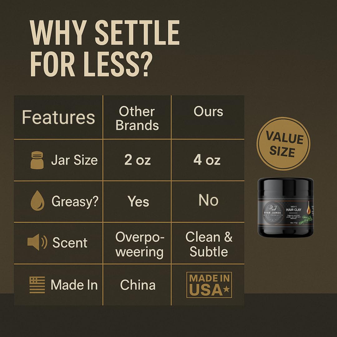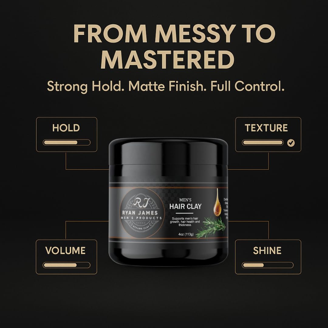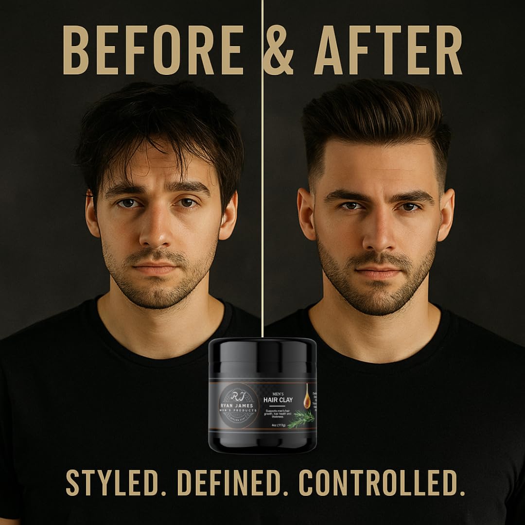 - Confidently styled with Ryan James hair clay 4oz of USA made, natural finish grooming for men who care about healthy, great-looking hair.