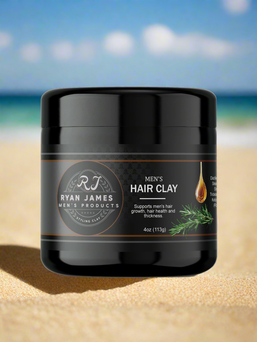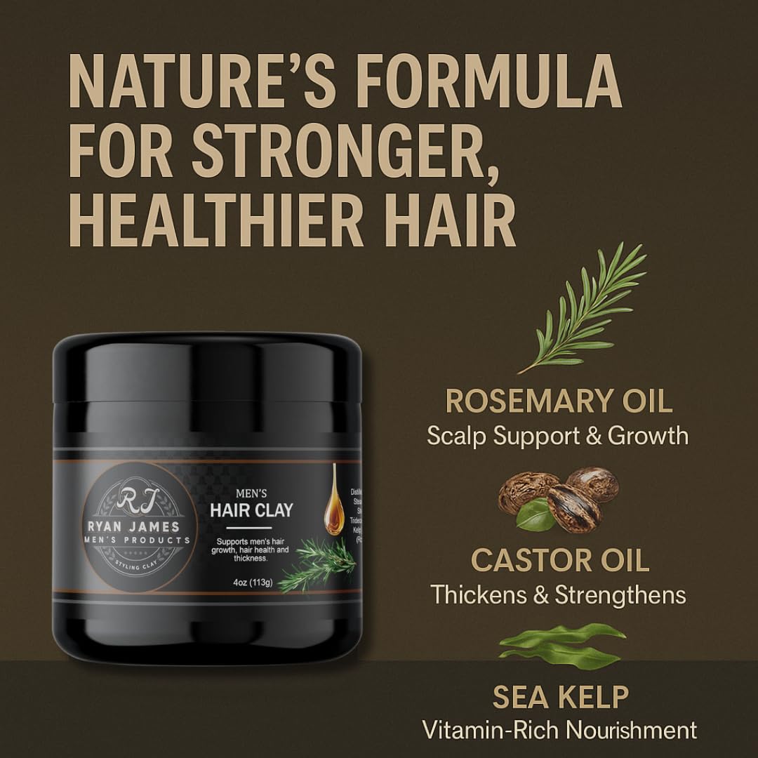 - Ryan James men's hair clay is enriched with natural ingredients like rosemary oil, castor oil, and sea kelp to support scalp health, promote hair growth, and strengthen strands designed for stronger, healthier hair.